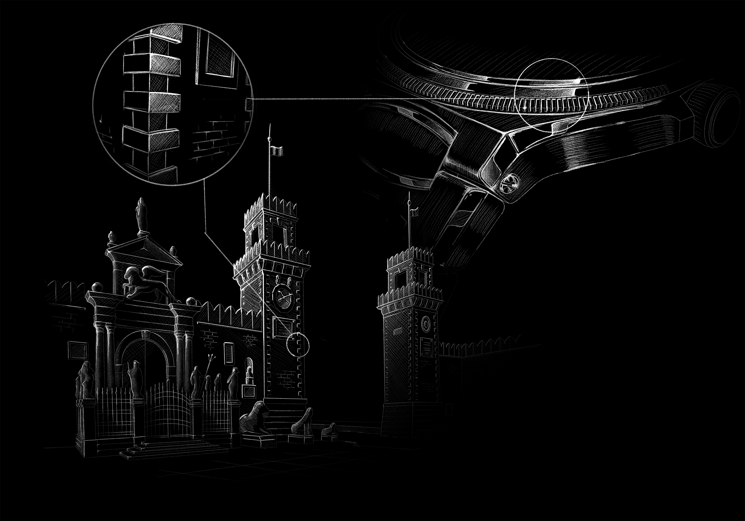 Le linee imponenti e armoniose dell’Arsenale hanno guidato la progettazione di questo segnatempo. L’essenzialità delle mura si traduce nelle forme pulite di cassa e bracciale, mentre i decori storici rivivono nelle zigrinature della lunetta e del fondello.