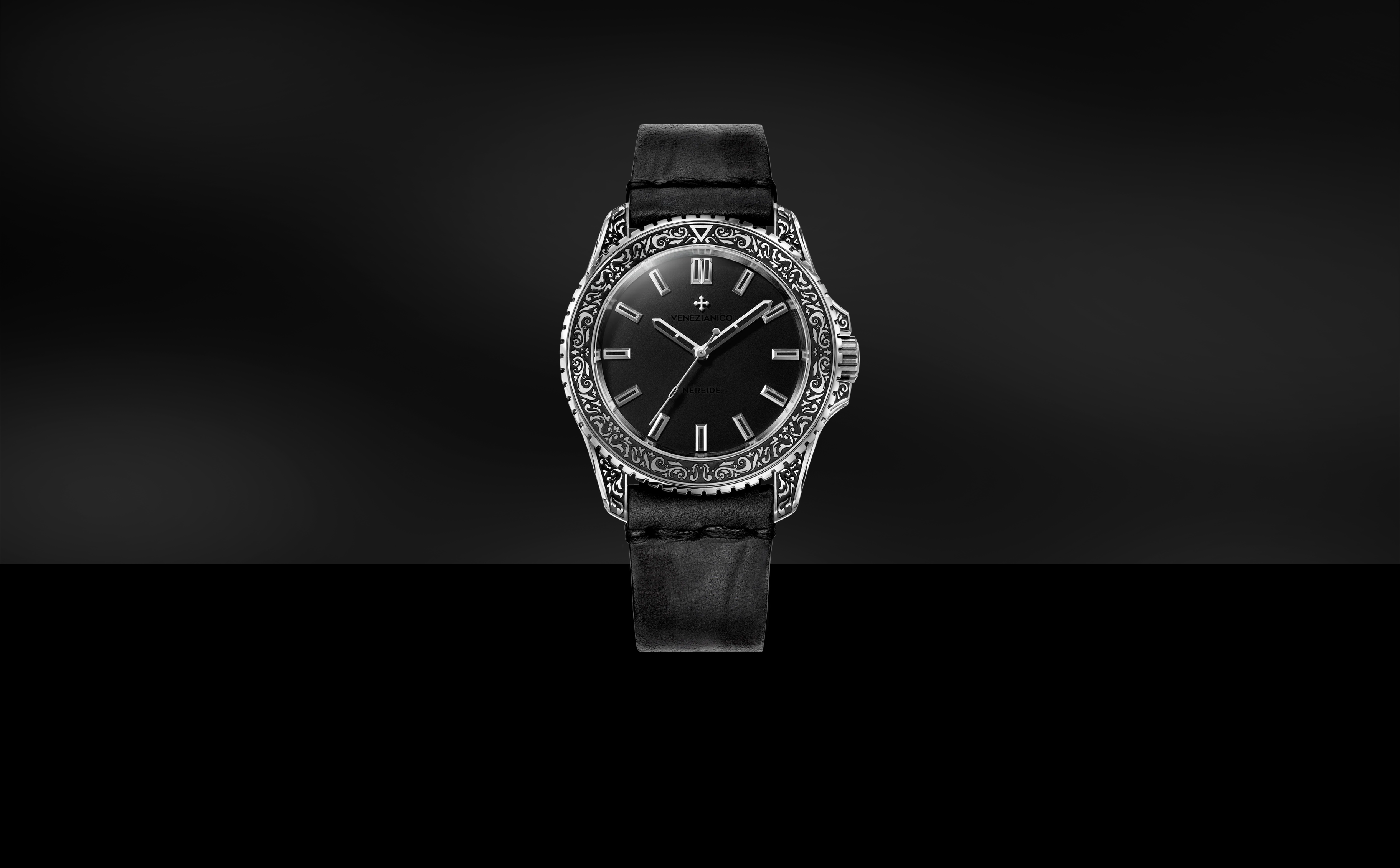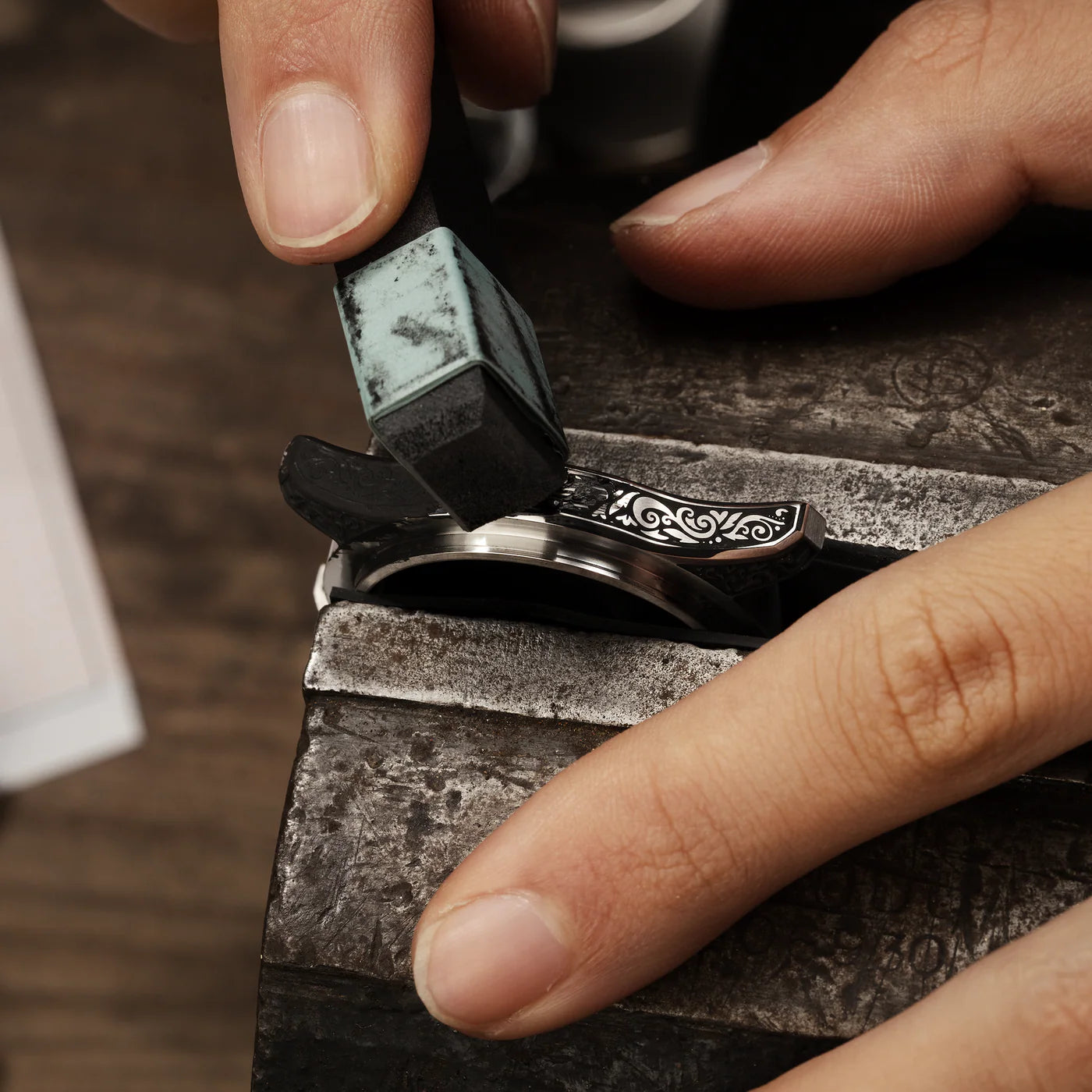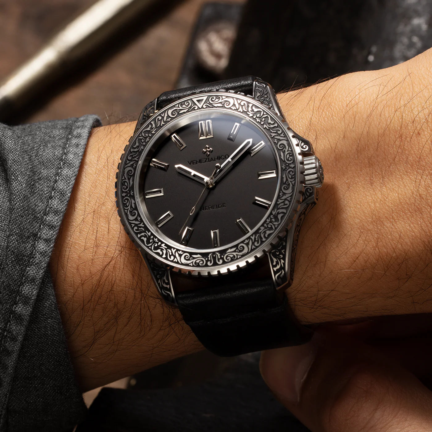Nereide Acquaforte trasforma la superficie della cassa in un linguaggio decorativo. Le incisioni, ispirate ai motivi classici delle foglie di acanto, dialogano con un quadrante essenziale dalle tonalità profonde, dove gli indici lucidi emergono con equilibrio misurato. L’impiego della Super-LumiNova® nera su indici e lancette introduce una luminescenza discreta ma efficace, capace di garantire leggibilità al buio senza rinunciare al carattere colto e senza tempo che definisce questo modello.