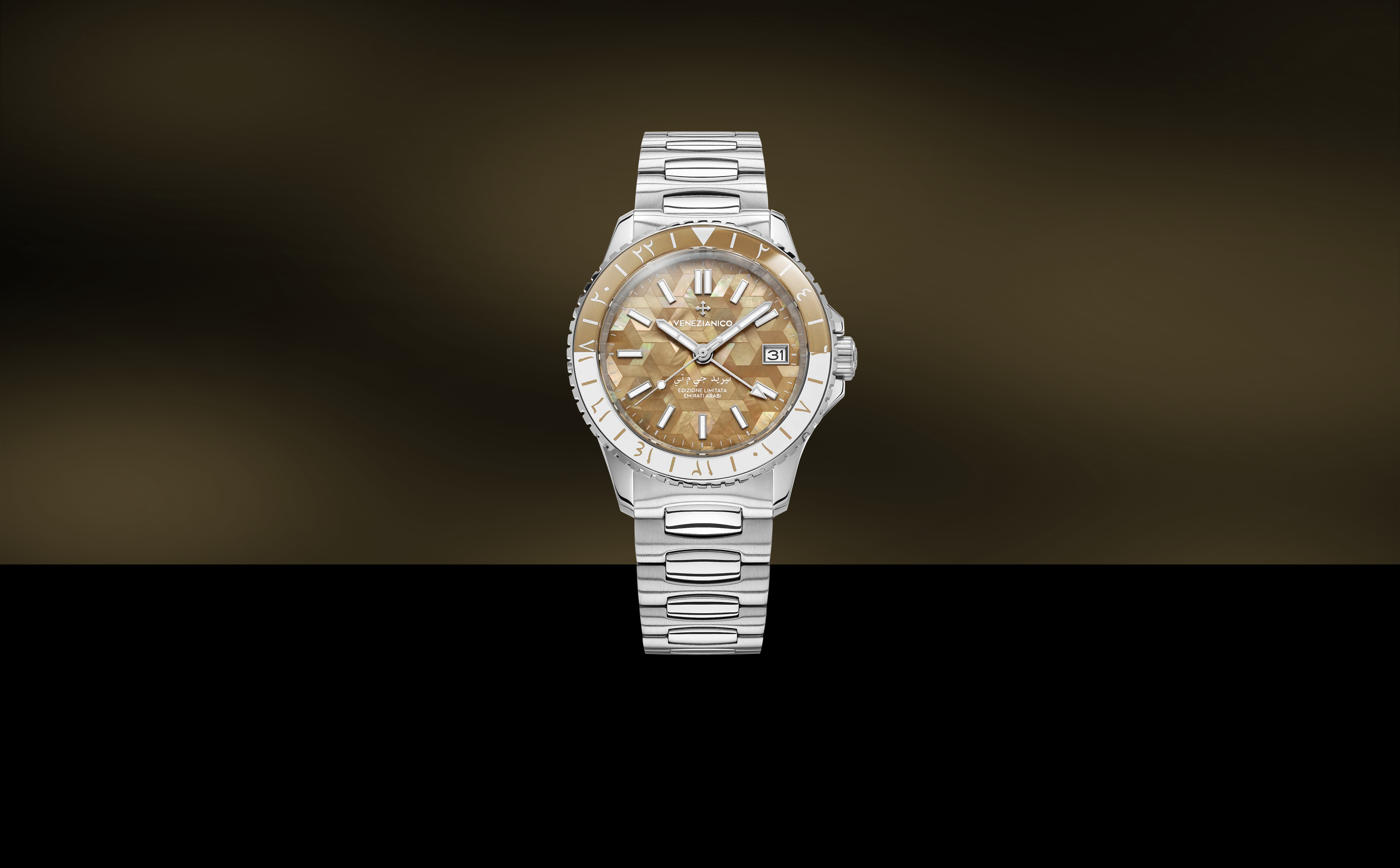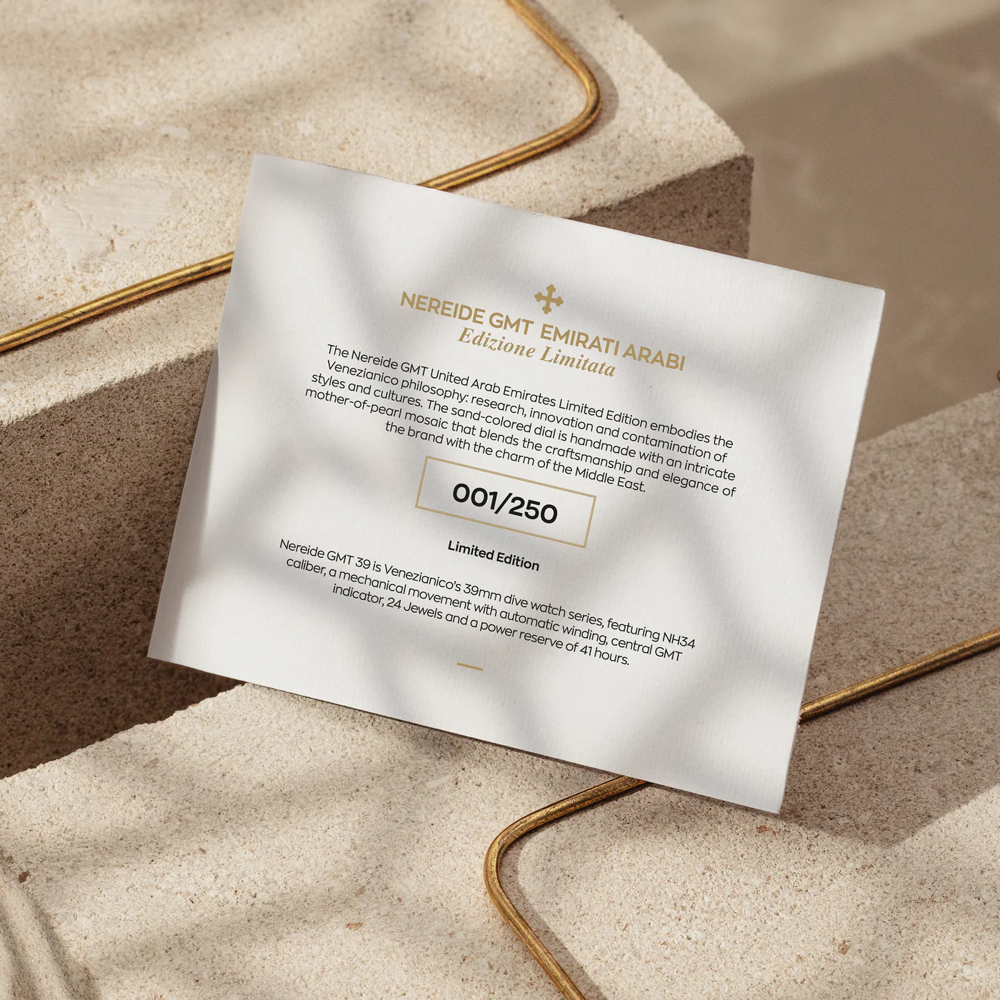 Realizzata in soli 250 esemplari numerati, questa Edizione Limitata rende omaggio agli Emirati Arabi, snodo storico delle rotte che per secoli hanno unito Venezia all’Oriente. Le decorazioni del quadrante, ispirate alla tradizione geometrica araba, prendono vita attraverso un mosaico in madreperla lavorato a mano, rendendo ogni segnatempo unico nella sua composizione e irripetibile nella sua espressione.