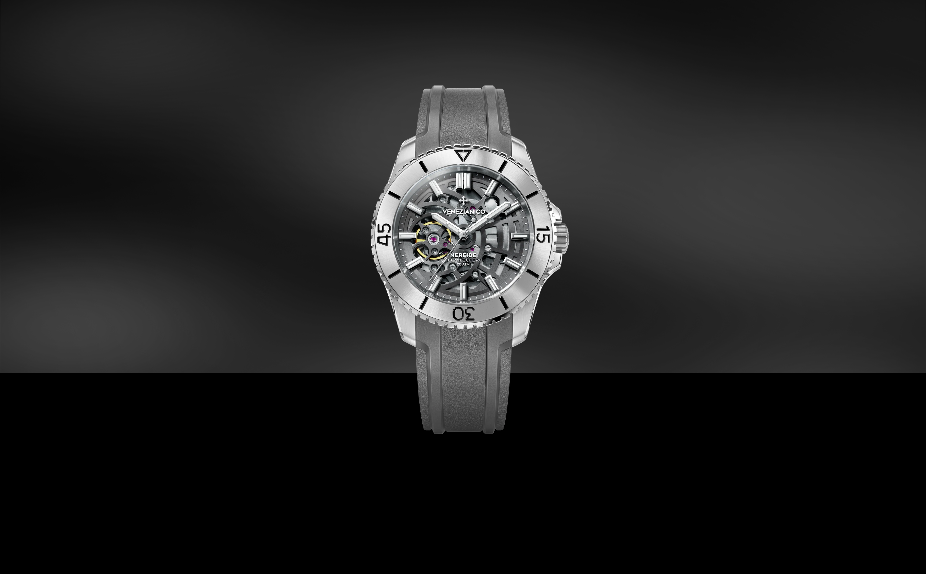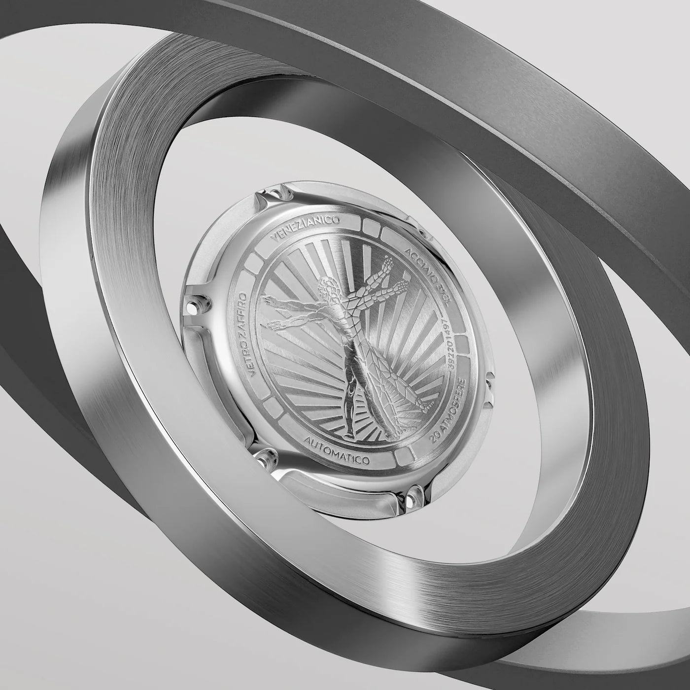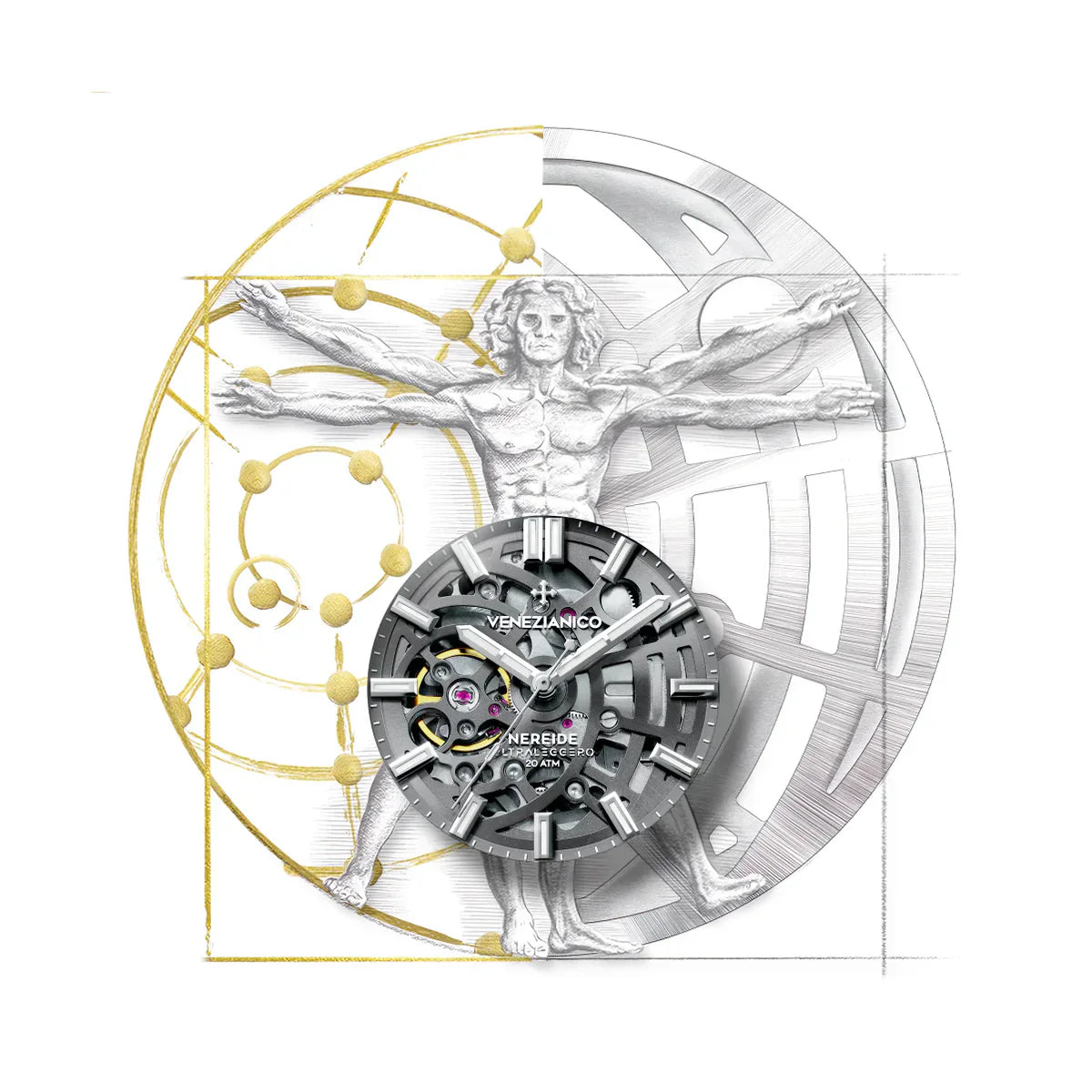 Nereide Ultraleggero rappresenta l’espressione più avanzata della collezione Nereide. Il progetto prende ispirazione dall’Uomo Vitruviano, emblema dell’armonia rinascimentale tra sapere artistico e rigore scientifico. Il quadrante scheletrato nasce da una geometria studiata per fondersi con l’architettura del movimento, grazie a una soluzione costruttiva brevettata che riduce peso e spessori, dando vita a un segnatempo essenziale, tecnico e sorprendentemente leggero.